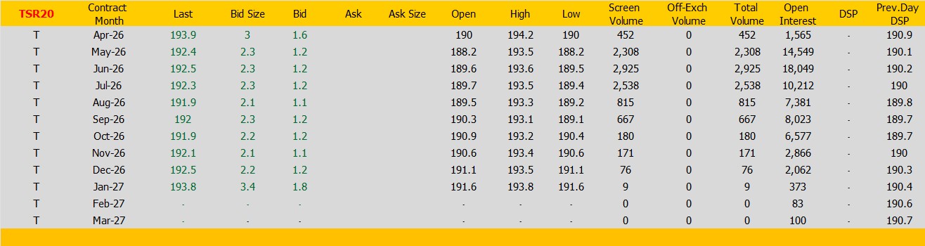 ราคายางTSR20 ตลาดยางSICOM ราคาส่งมอบเดือน เม.ย.ปิดที่193.9 เซนต์สหรัฐ  ราคาเพิ่มขึ้น 3 เซนต์สหรัฐหรือ คิดเป็นเปอร์เซนต์ +1.57% %