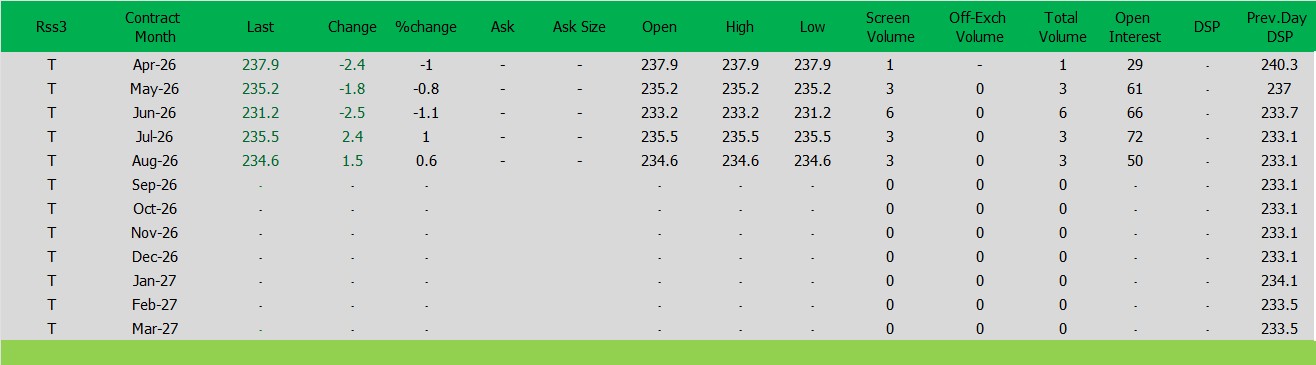 ราคาปิดตลาดยาง SICOMประจำวัน อังคาร ที่ 24มีนาคม2569ราคายาง RSS3 ราคาเดือนเม.ย. ราคาลดลง -2.4เซนต์สหรัฐ ปิดที่ 237.9 เซนต์สหรัฐ