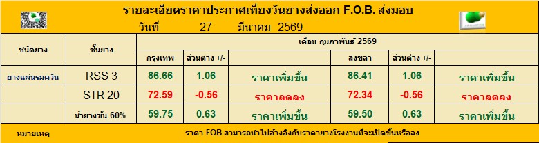 รายละเอียดราคาประกาศเที่ยงวันยางส่งออก F.O.B. ส่งมอบ ประจำวัน ศุกร์ ที่ 27 มีนาคม 2569
